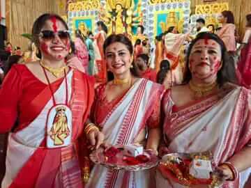 सिंदूर खेला के साथ माता की विदाई:बंगाली समाज ने खुशी-खुशी किया बेटी को ससुराल विदा, आज होगा माता का विसर्जन