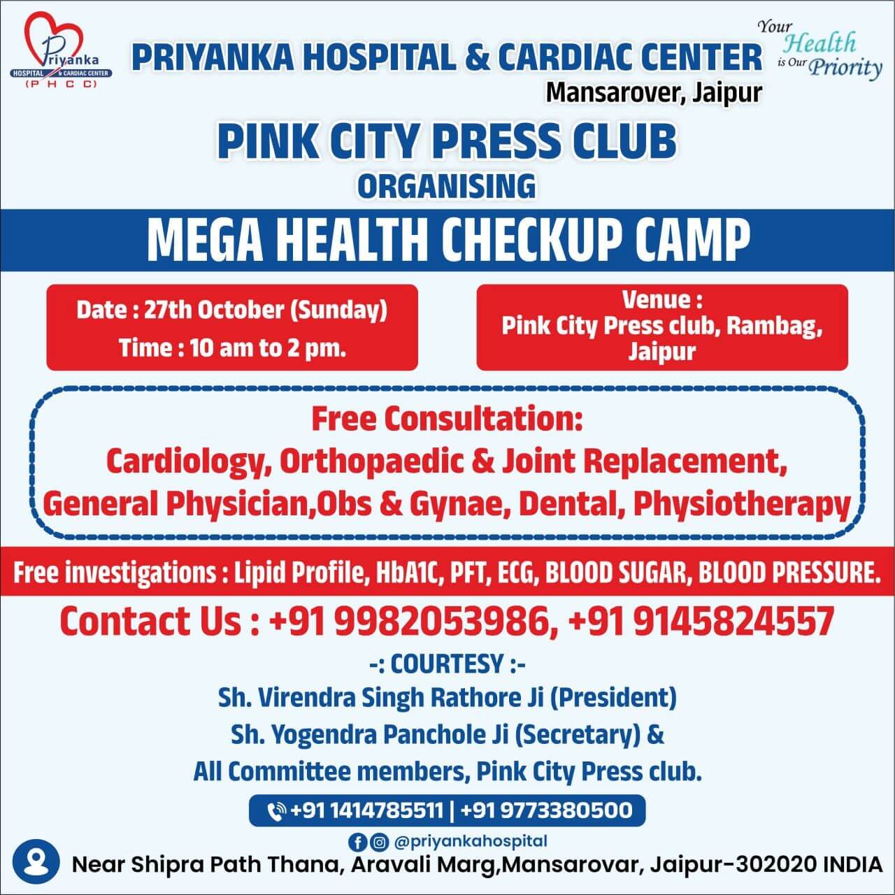 पिंकसिटी प्रेस क्लब में पत्रकारों के लिए निशुल्क चिकित्सा शिविर का आयोजन