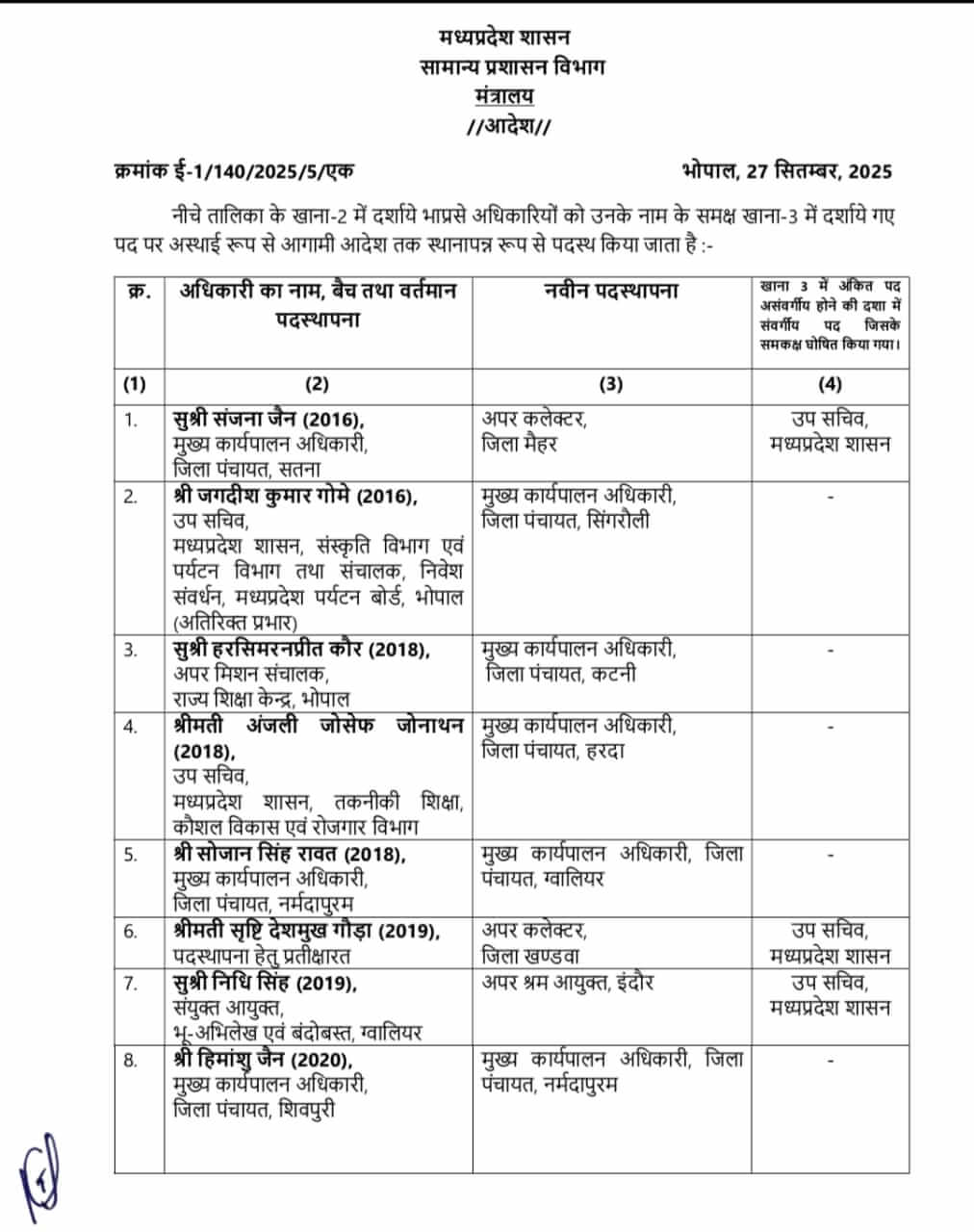 आधी रात में 18 आईएएस, 8 एसएएस के तबादले:20 CEO पंचायत और अपर कलेक्टर पदों पर पोस्टिंग, कई जिलों में दोहरा प्रभार सौंपा