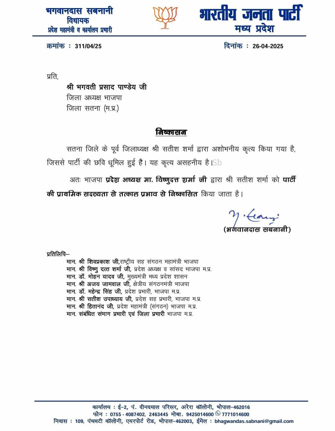 भाजपा ने सतना के पूर्व जिलाध्यक्ष सतीश शर्मा को पार्टी से निष्कासित किया**