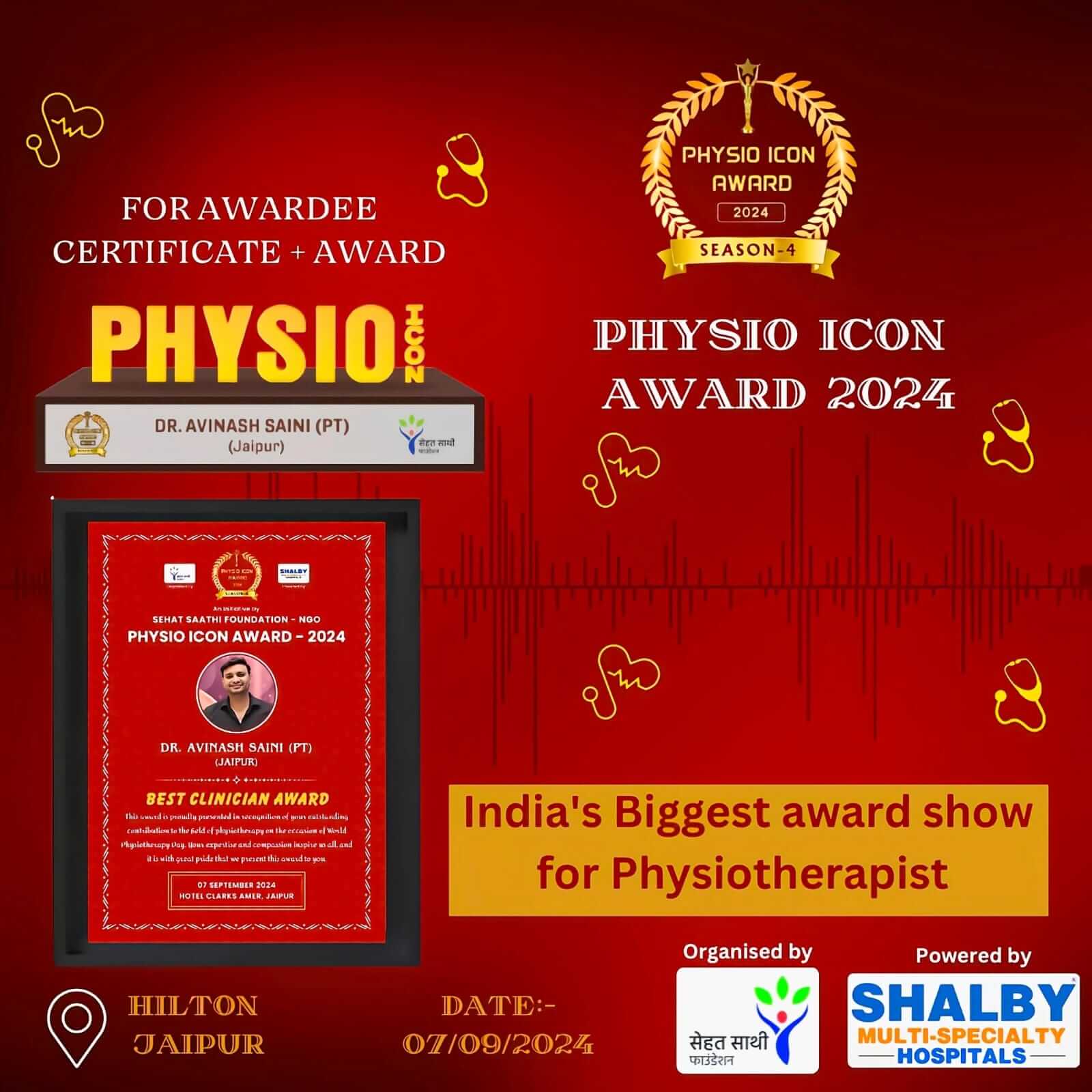 जयपुर, फिजियोथेरेपी के क्षेत्र में उत्कृष्ट योगदान देने वाले देश भर के फिजियोथेरेपिस्टों को सम्मानित करने के लिए *फिजियो आइकॉन अवॉर्ड 2024* का आयोजन ...