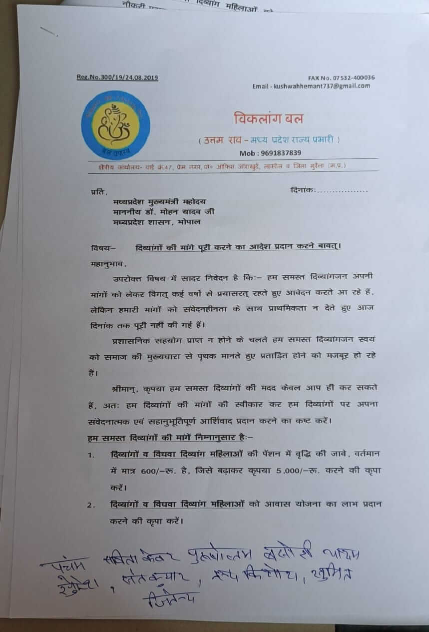 जबलपुर, 9 सितंबर 2025। विकलांग बल मध्यप्रदेश ने आज मुख्यमंत्री एवं कलेक्टर के नाम पर ज्ञापन सौंपकर विकलांगों की समस्याओं और मांगों को सामने रखा। ज्ञापन में मुख्य रूप से वर्तमान ₹600 पेंशन को बढ़ाकर ₹5000 प्रतिमाह करने की मांग रखी गई। इसके अलावा अन्य सुविधाओं और अधिकारों को लेकर भी सरकार का ध्यान आकर्षित किया गया।