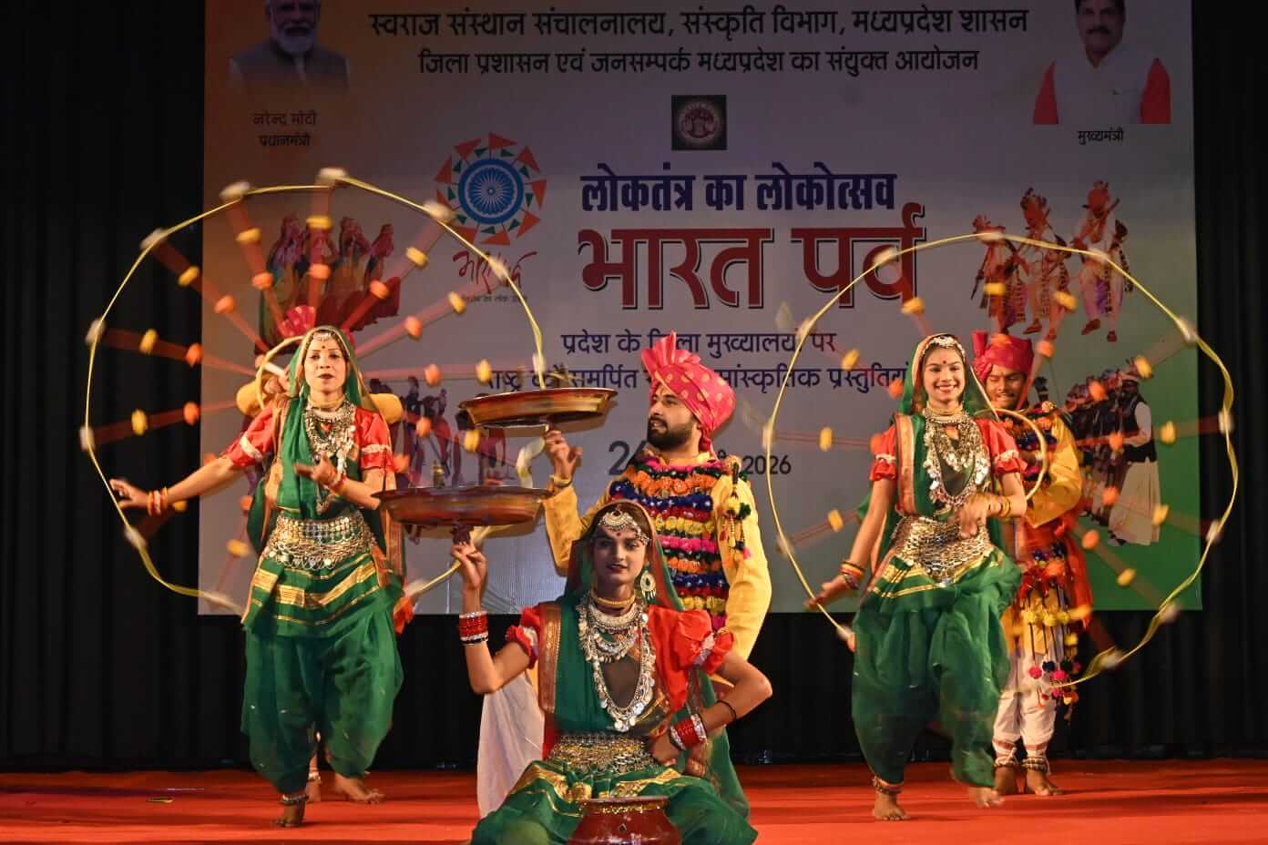 जबलपुर भारतीय गणतंत्र के गौरव का प्रतीक भारत पर्व गणतंत्र दिवस की संध्या पर शहीद स्मारक में हर्षोल्लास के साथ मनाया गया। यह कार्यक्रम स्वराज संचालनालय संस्कृति विभाग और जिला प्रशासन द्वारा आयोजित की गई थी।कार्यक्रम का विधिवत शुभारंभ नगर निगम कमिश्नर रामप्रकाश अहिरवार और अपर कलेक्टर श्री नाथूराम गोंड ने किया। इस अवसर पर अन्य वरिष्ठ अधिकारियों सहित बड़ी तादात में आमजन मौजूद थे। भारत पर्व में संस्कृति मंत्रालय भोपाल की ओर से आए कलाकारों ने अपनी मन मोहक प्रस्तुतियों से दर्शकों को मंत्रमुग्ध कर दिया। जिसमें पारंपरिक बुंदेली गायन और लोक नृत्य ने दर्शकों को भावविभोर कर दिया।देशभक्ति गीतों की श्रृंखला ने आयोजन स्थल को राष्ट्रभक्ति के स्वर से गुंजायमान कर दिया।