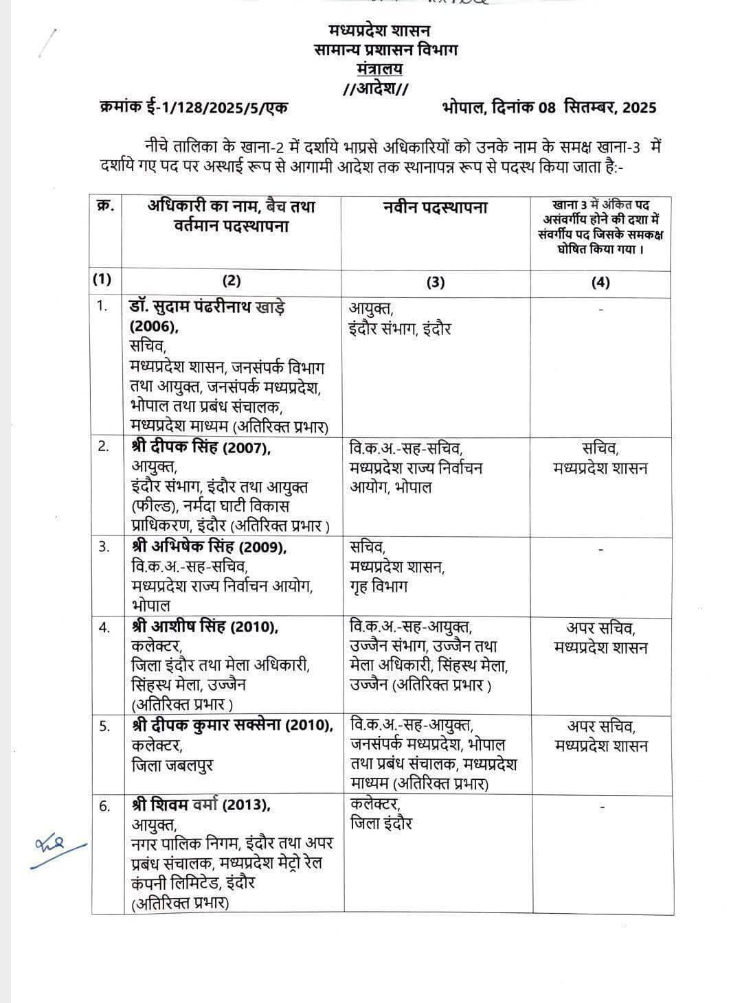 दीपक सक्सेना — वर्तमान जबलपुर कलेक्टर को अपर सचिव व सह-आयुक्त (मध्य प्रदेश जनसंपर्क) का प्रभार सौंपा गया।