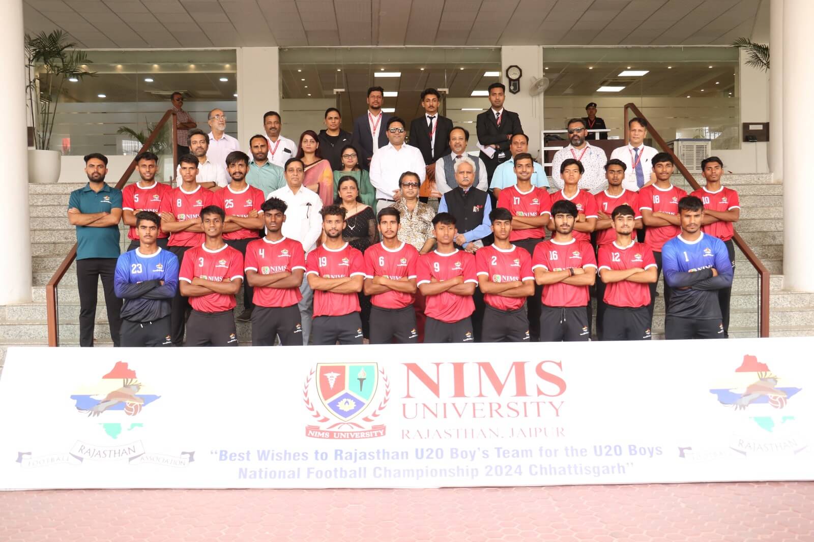 वाईस चेयरपर्सन डाॅ. शोभा तोमर ने बताया टीम की जर्सी के अनावरण से आगामी नेशनल चैंपियनशिप की एक प्रतीकात्मक शुरुआत हुई, जो एकता और दृढ़ संकल्प की भावना को समाहित करती है एवं राजस्थान फुटबॉल टीम को प्रोत्साहित करती है।फर्स्ट इंडिया न्यूज के डायरेक्टर, महिपाल सिंह निंबाहेड़ा ने अपनी उपस्थिति से इस कार्यक्रम की शोभा बढ़ाई और राष्ट्रीय फुटबॉल प्रतियोगिता के लिए राजस्थान फुटबॉल टीम के खिलाडियो को प्रोत्साहन दिया। चेयरपर्सन डॉ.बी. एस. तोमर ने टीम को अपना आशीर्वाद दिया और उनकी यात्रा के केंद्र में खेल भावना और सौहार्द के मूल्यों को रेखांकित किया। रजिस्ट्रार डाॅ. संदीप त्रिपाठी ने टीम को हार्दिक शुभकामनाएं प्रदान की। सामूहिक फोटो सत्र ने सभा में व्याप्त सौहार्द और दृढ़ संकल्प की सामूहिक भावना को प्रदर्शित किया, जो खेल के माध्यम से बनी एकता की याद दिलाता विशिष्ट अतिथि डाॅ.अशोक आचार्य, राज्यपाल प्रतिनिधि बोम मेम्बर राजस्थान स्वास्थ्य विज्ञान विश्वविद्यालय, जयपुर ने खेल एवं खिलाडियो की उत्कृष्टता को बढ़ावा देने, भावी पीढ़ी के चैंपियनों के उभरने का मार्ग प्रशस्त करने के क्षेत्र मे निम्स युनिवर्सिटी स्पोर्ट्स बोर्ड की प्रतिबद्धता की सराहना की। संयोजक डाॅ. कुलदीप सिंह झाला ने निम्स युनिवर्सिटी स्पोर्ट्स बोर्ड के माध्यम से तथा राजस्थान फुटबॉल संघ के सहयोग से राष्ट्रीय स्तर के फुटबॉल मैदान को तैयार करने की दिशा मे शीघ्र कार्य प्रारंभ करने का प्रस्ताव रखा।राजस्थान फुटबॉल संघ के सचिव दिलीप सिंह शेखावत ने राष्ट्रीय प्रतियोगिता के लिए राजस्थान फुटबॉल टीम के खिलाडियो को प्रोत्साहित करने के लिए निम्स विश्वविद्यालय के प्रशासन एवं युनिवर्सिटी स्पोर्ट्स बोर्ड का आभार व्यक्त किया।