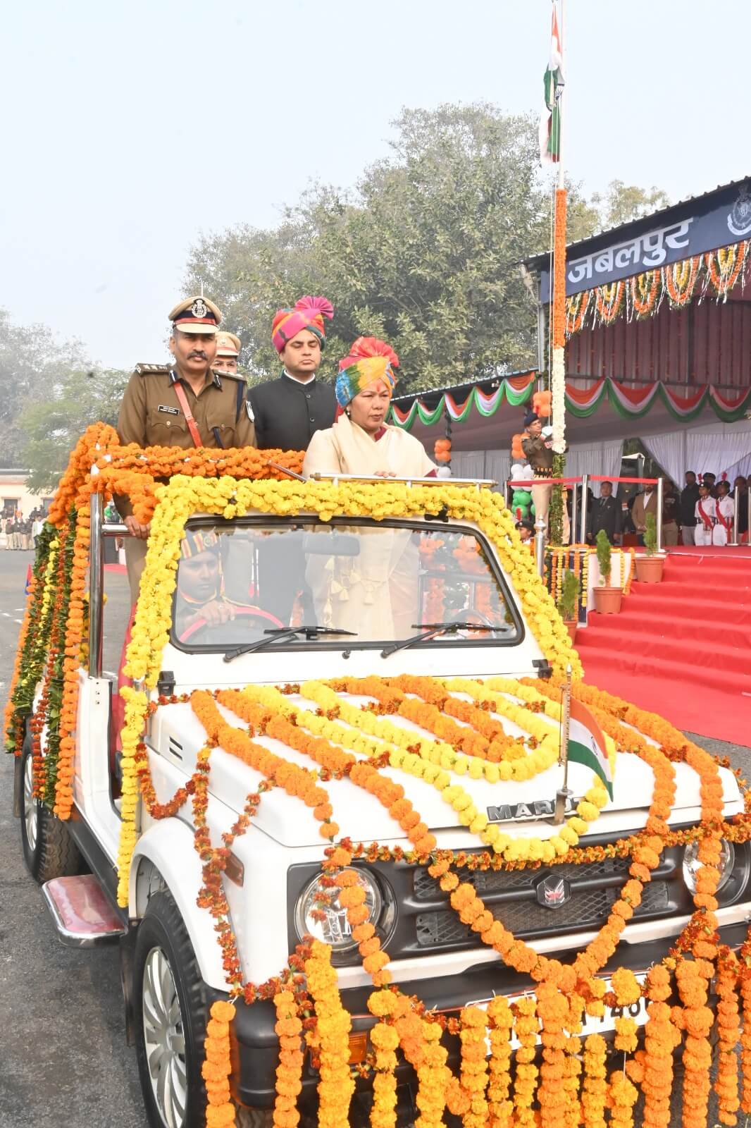 गणतंत्र दिवस के जिले के मुख्‍य समारोह में राष्‍ट्र ध्‍वज तिरंगा फहराने के बाद लोक स्‍वास्‍थ्‍य यांत्रिकी मंत्री श्रीमती सपंतिया उइके ने खुली सफेद जिप्सी में कलेक्टर राघवेन्‍द्र सिंह एवं पुलिस अधीक्षक संपत उपाध्याय के साथ परेड का निरीक्षण किया। उन्होंने मुख्यमंत्री डॉ. मोहन यादव का प्रदेश की जनता के नाम गणतंत्र दिवस के संदेश का वाचन किया। इस मौके पर सशस्त्र बलों ने हर्षफायर किये तथा छठवीं बटालियन के बैंड दल द्वारा राष्ट्रगान की धुन बजाई गई। लोक स्‍वास्‍थ्‍य यांत्रिकी मंत्री श्रीमती उइके ने तिरंगे के तीन रंगों के गुब्बारे मुक्त आकाश में छोड़े। समारोह में परेड द्वारा शानदार मार्चपास्ट प्रस्तुत किया गया।