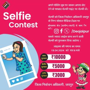 जिला स्वीप नोडल अधिकारी डॉ. शिल्पा सिंह ने बताया कि यूथ को बूथ तक लाने के लिए मतदान दिवस 19 अप्रैल को सेल्फी कॉन्टेस्ट आयोजित किया जाएगा। कॉन्टेस्ट में भाग लेने के लिए प्रतिभागी को मतदान केन्द्र पर वोट डालने के बाद सेल्फी पॉइन्ट पर जाकर सेल्फी लेनी होगी। इसके बाद सेल्फी को लोकसभा क्षेत्र जयपुर अथवा जयपुर ग्रामीण के साथ जिला निर्वाचन अधिकारी के फेसबुक, एक्स, इंस्टाग्राम सोशल मीडिया हैंडल (@deojaipur) पर टैग करना होगा। सेल्फी पर लाइक की गणना 19 अप्रैल को रात 8:00 बजे की जाएगी।