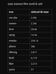 | राज्य | फॉलोअर्स की संख्या |